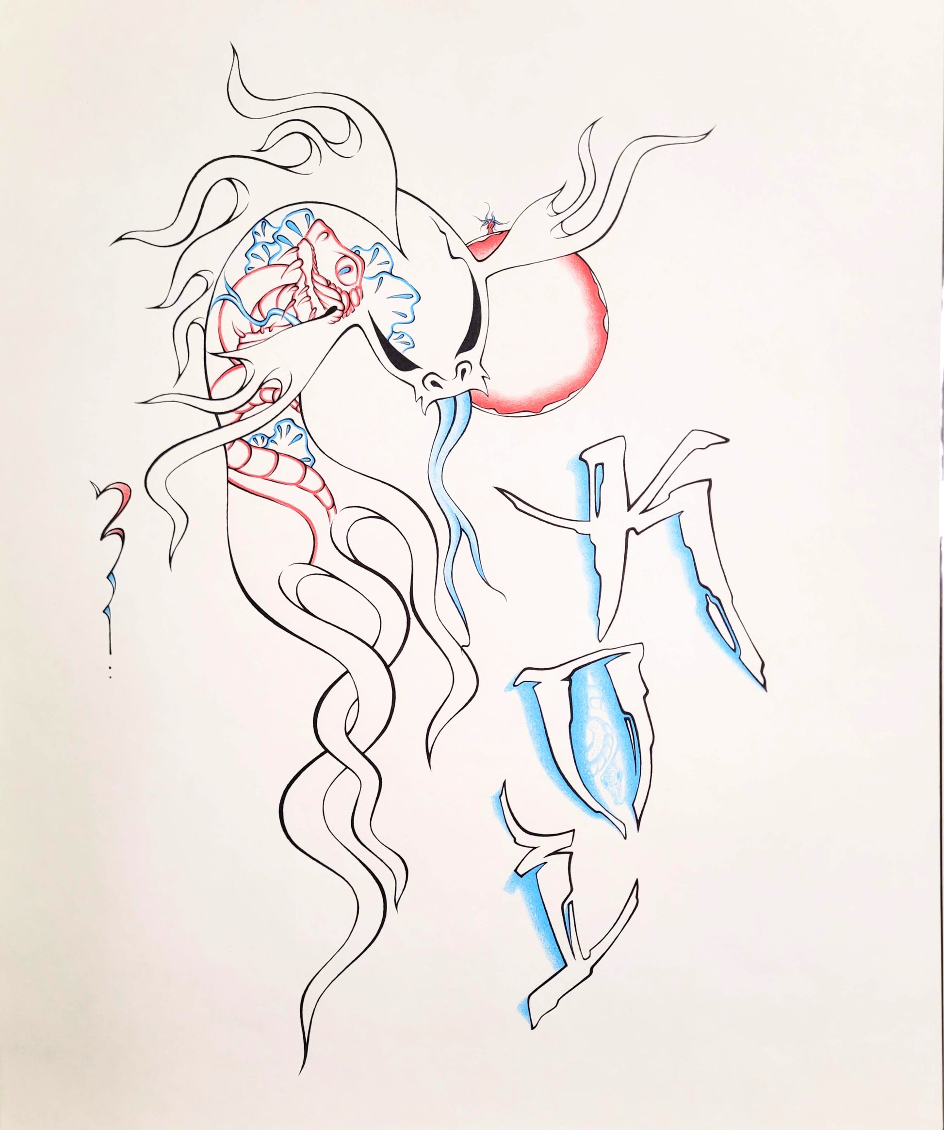 Experience the captivating combination of a koi fish and a cobra with the Twisted Cobra Koi original colored pencil piece. Featuring a palette of reds and blues with fine detailing, this 14x17 original gives you plenty to explore and more detail than first meets the eye. Can you find the other cobra?